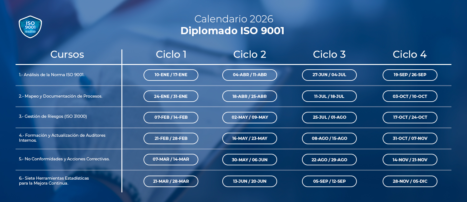 El diplomado ISO 9001 está diseñado para proporcionar los conocimientos, la documentación y las habilidades necesarias para diseñar, implementar y mantener un Sistema de Gestión de la Calidad conforme a la norma ISO 9001.