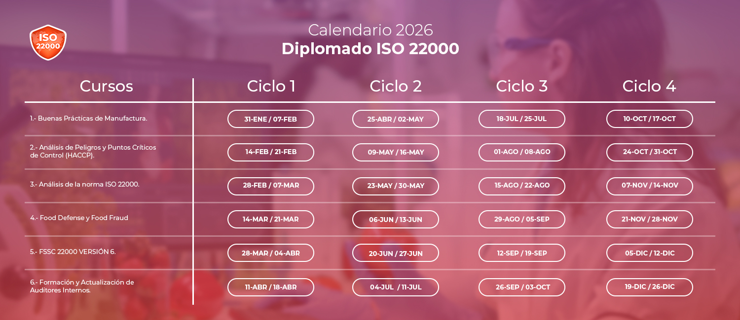 El diplomado ISO 22000 está diseñado para organizaciones que buscan implementar un Sistema de Gestión de Inocuidad Alimentaria que garantice a sus clientes que sus productos y servicios cumplen con los requisitos de calidad e inocuidad.